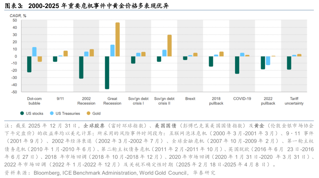 当地缘事件激发经济和货币政策收紧担忧时,流动性消弱和风险偏好下降通常会激发股票等风险财富的大幅回撤,此时黄金也进展出优秀的风险对冲属性。据国际金协《Why gold in 2026? A cross-asset perspective》(2026.02.26),黄金在2000-2025年的紧要危境事件时候,除互联网泡沫危境外,均获取了正收益,比较好意思债有更好的风险对冲后果。此外,2015-2025时候,当好意思股出现显耀下调时,黄金也能有很好的风险对冲后果。