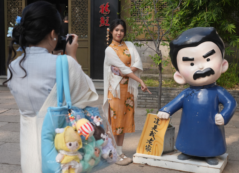新华社相片,绍兴(浙江),旅客在鲁迅故里和鲁迅的创意泥像合影。