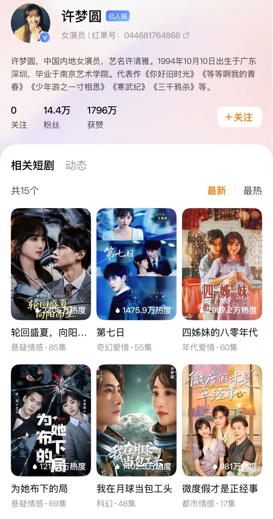 “我既不扼杀,我也不怕。”“90后”知名短剧演员许梦圆毕业于南京艺术学院,主演的《裴总每天都想父凭子贵》红果热度值2332万,《情谊试真金不怕火》热度值3657万,《四姊妹的八零年代》热度值2964万,均是平台上的“爆剧”。