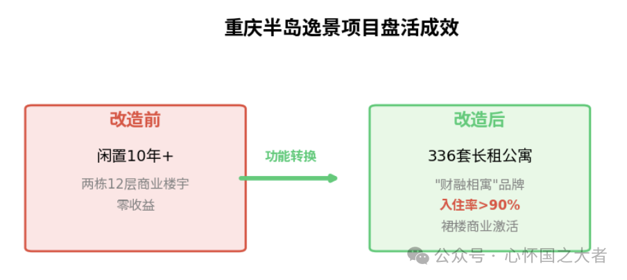 重庆半岛逸景公租房配套贸易名目的周转,号称功能转移的典范。该名目配套贸易楼宇闲置卓越10年——两栋12层的大楼兀立在公租房社区,却长久无法激活。重发置业公司经受后,突破传统想路,莫得浮浅地将它们手脚平庸商铺招租,而是研判市场需求后作出神勇决定:将这两栋楼纠正为336套保障性租赁住房,打造“财融相寓”长租公寓品牌,作为大渡口区东说念主才公寓插足使用。