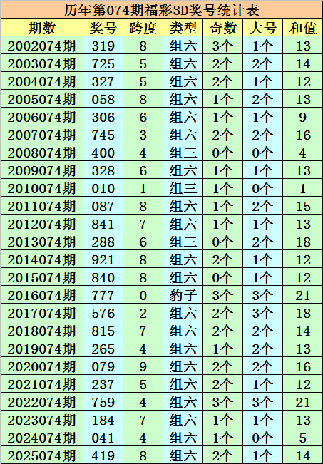 在以上奖号中奖,积年第074期福彩3D出现1次豹子,出现3次组三,出现20次组六。组六开出比例较高,本期络续怜惜组六。