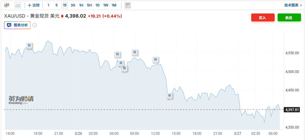 由于好意思国总统特朗普就好意思国与伊朗是否概况达成条约以已毕这地方手续近一个月战斗开释出相互矛盾的信号,环球阛阓进一步飘荡,黄金价钱随之下落。周四,黄金价钱一度下落最多3.4%、接近技巧性熊市——经常界说为较近期高点下落20%,但在特朗普默示将延伸暂停打击伊朗动力局面的期限后收窄部分跌幅。特朗普在社交平台上发文称,“谈判仍在进行中”,“尽管所谓的‘假新闻媒体’过火他东说念主的无理说法相背,谈判推崇相等顺利”。截止发稿,黄金现货涨0.44%,接近4400好意思元/盎司。