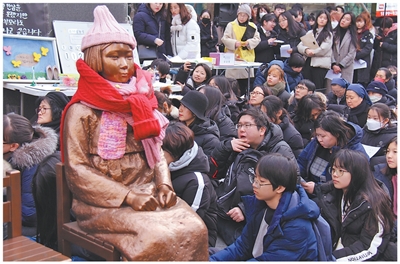 韩国人人在齐门首尔一处标志日军“慰安妇”受害者的“和平青娥”雕像周围举行抗议行径。 本报记者 陈尚文摄