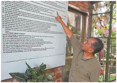 马来西亚槟城干戈博物馆创建者佐哈里在展板前先容日军占领槟城后发布的“38项严令”。 本报记者 白元琪摄