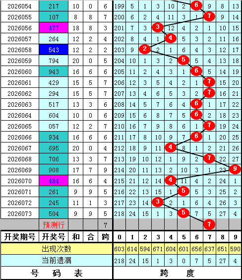 福彩3D第2026073期最大跨度开出5,近期最大跨度波动较大,本期预测最大跨度在5-9区段开出,最大跨度参考6789,一码跨度参考7。